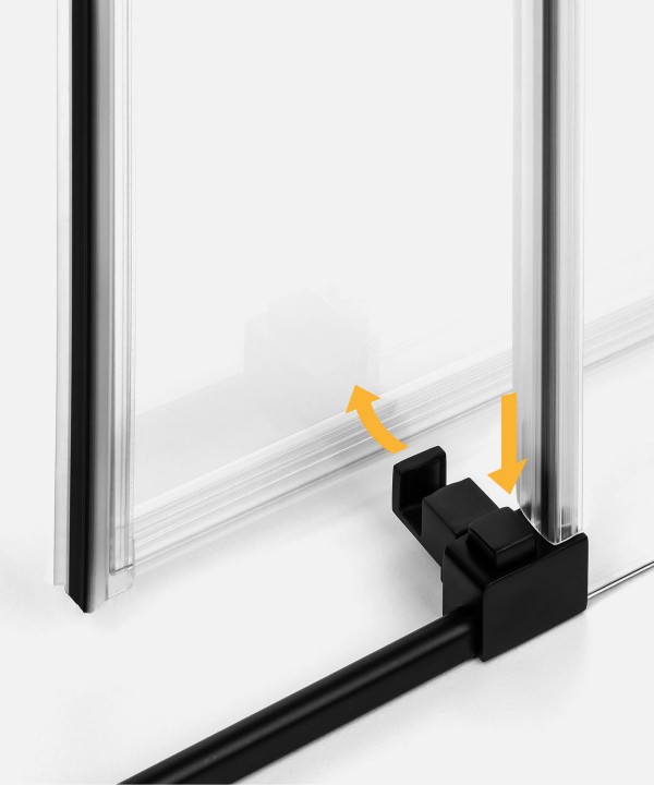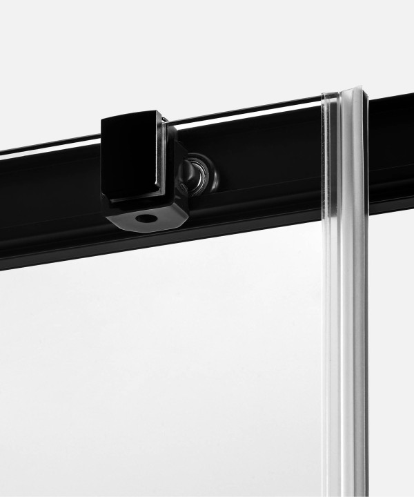Skivedøren glir mot venstre, og konstruksjonen er utviklet med PRIME™ sin QuickClick-teknologi: en monteringsmetode som kutter ned installasjonstiden og gir en mer presis tilpasning i nisjer og hjørner. Glasset er 6 mm herdet klarglass behandlet med Active-Shield 2.0, som forenkler renholdet og reduserer behovet for vedlikehold.
